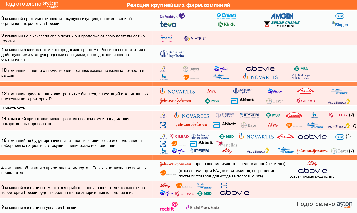 Мы продолжаем следить за заявлениями крупнейших зарубежных фармацевтических компаний по поводу ограничения их деятельности в России. Представляем Вам обновленную информацию ниже. Также, мы собрали информацию о реакции на санкции других компаний, работающих в сфере здравоохранения.