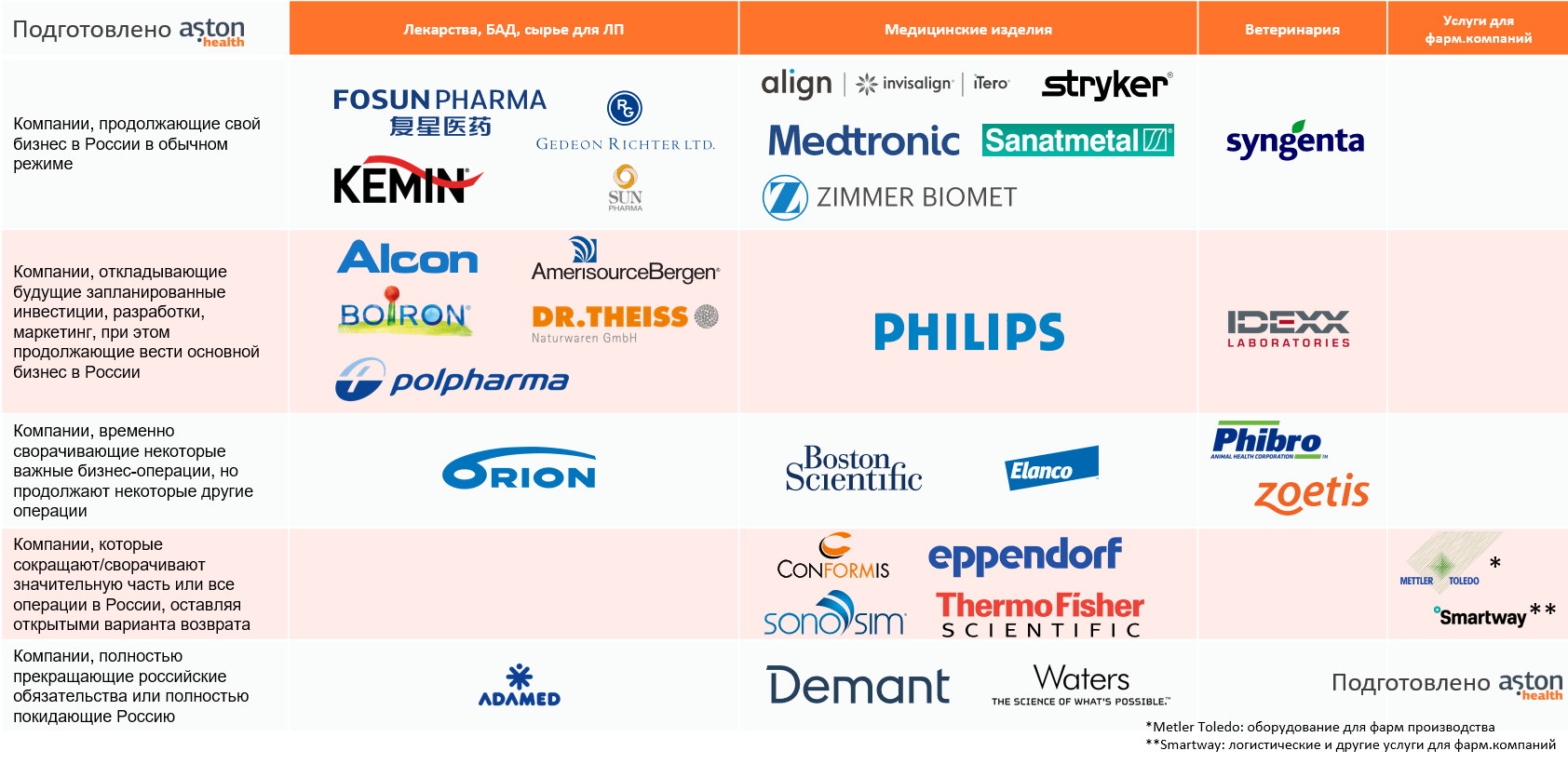 Приводим заявления других компаний в сфере здравоохранения по поводу ограничений бизнеса в РФ. По данным Йельской школы менеджмента. Компании распределены на 4 категории по уровню ограничений.